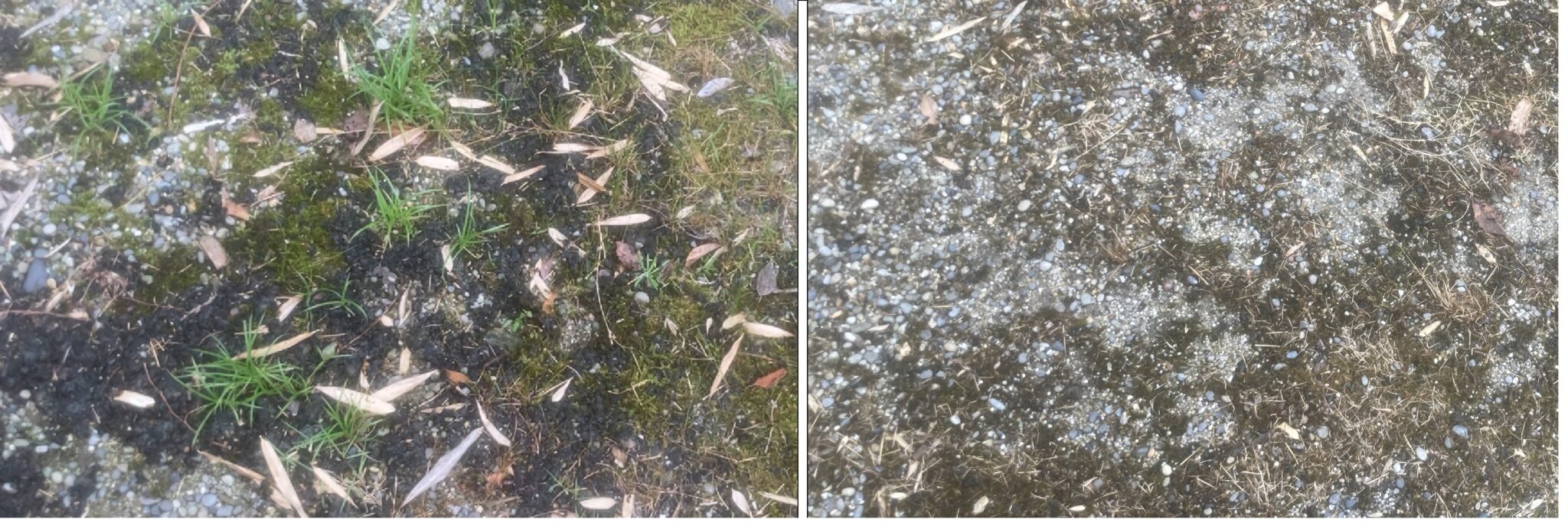 6月22日に、YASUYO庭の駐車場に群生していたイシクラゲとコケに対して、「キレダー水和剤(50倍希釈)」を散布しました。今回はその1週間後の変化についてご報告します。