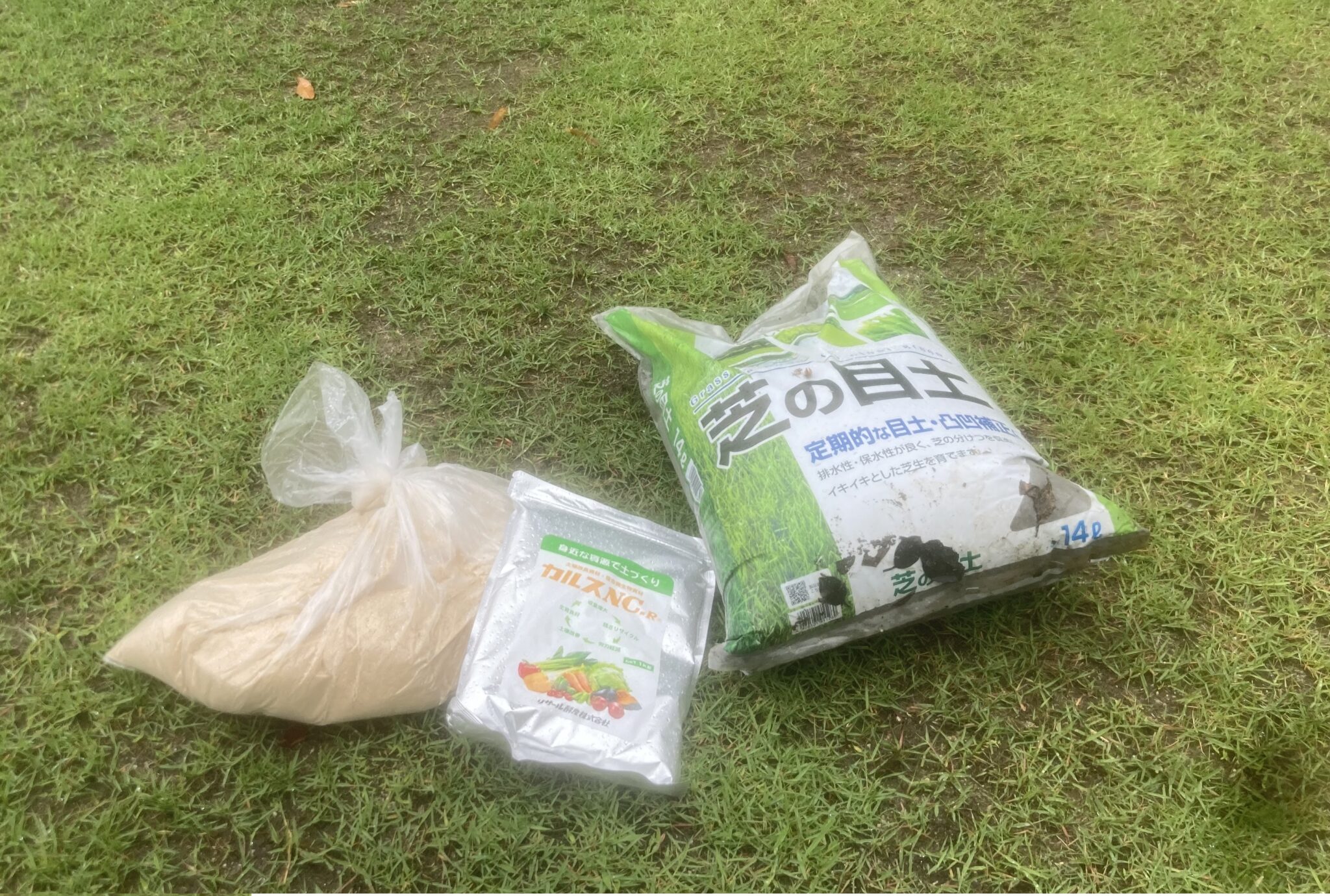 YASUYO庭の芝生は5月から毎週20㎜の刈り高で芝刈りをしています。その効果もあってか全体的に緑が広がり芝の密度も上がってきています。しかし、元々車が乗り上げていた写真右側のエリアは土壌が固く締まっており、水はけも悪く、芝の生長が思わしくありません。今回土壌の状態が悪いところに部分的に土壌改良材(カルスNC-R)を投入しました。